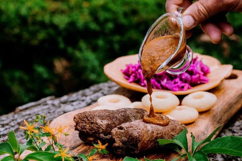 Stół beskidzki, który promujemy, opiera się na dawnych zwyczajach pasterskich. Charakteryzują go proste i skromne potrawy, z ziemniakami i mąką jako głównymi składnikami. Dzięki lokalnej hodowli owiec i tradycji pasterskiej, nasze menu wzbogacają dodatki mięsne, mleko oraz jego przetwory. Nie brakuje też aromatycznych wypieków, domowej kwaśnicy czy powszechnie uwielbianych placków ziemniaczanych, które zachwycają swoim smakiem i prostotą.