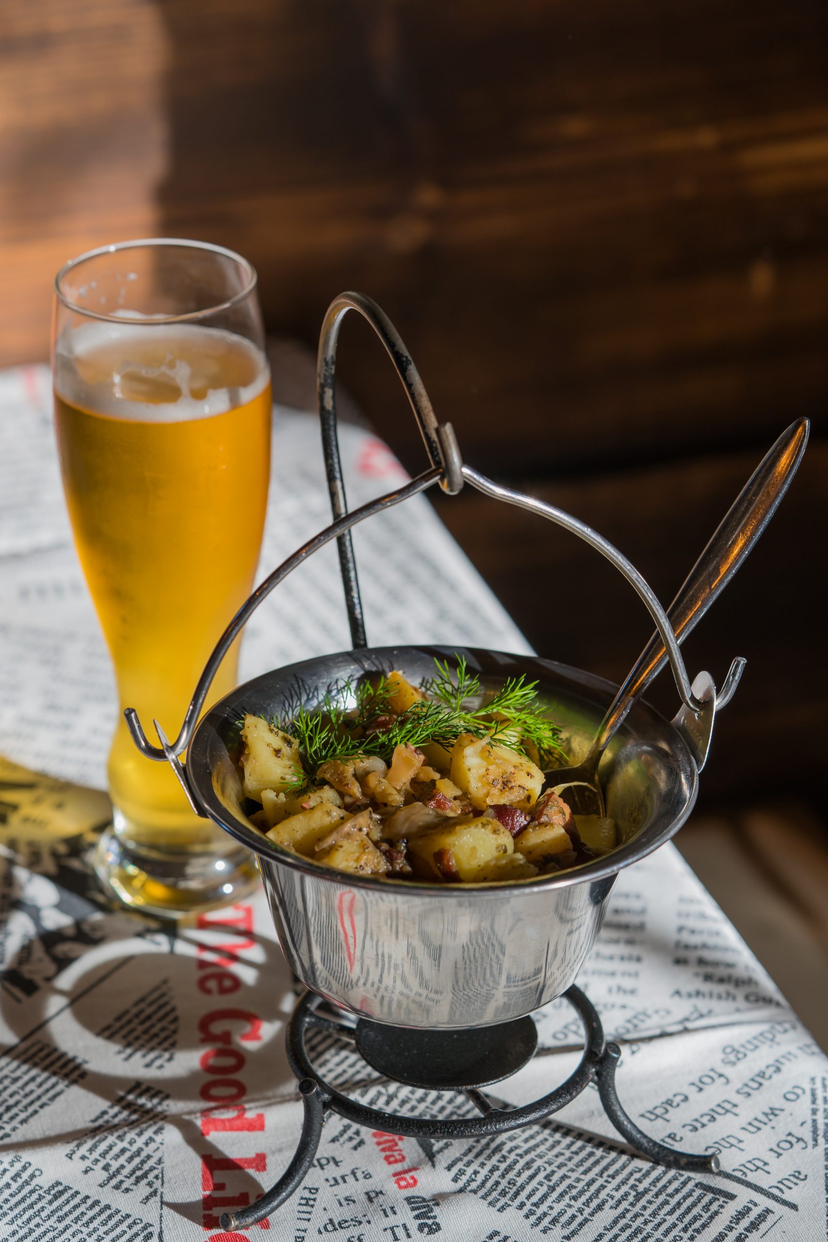 Duszonki Rogate podane w kociołku diabelskim z ziemniakami, boczkiem, kiełbasą, cebulą, kapustą białą